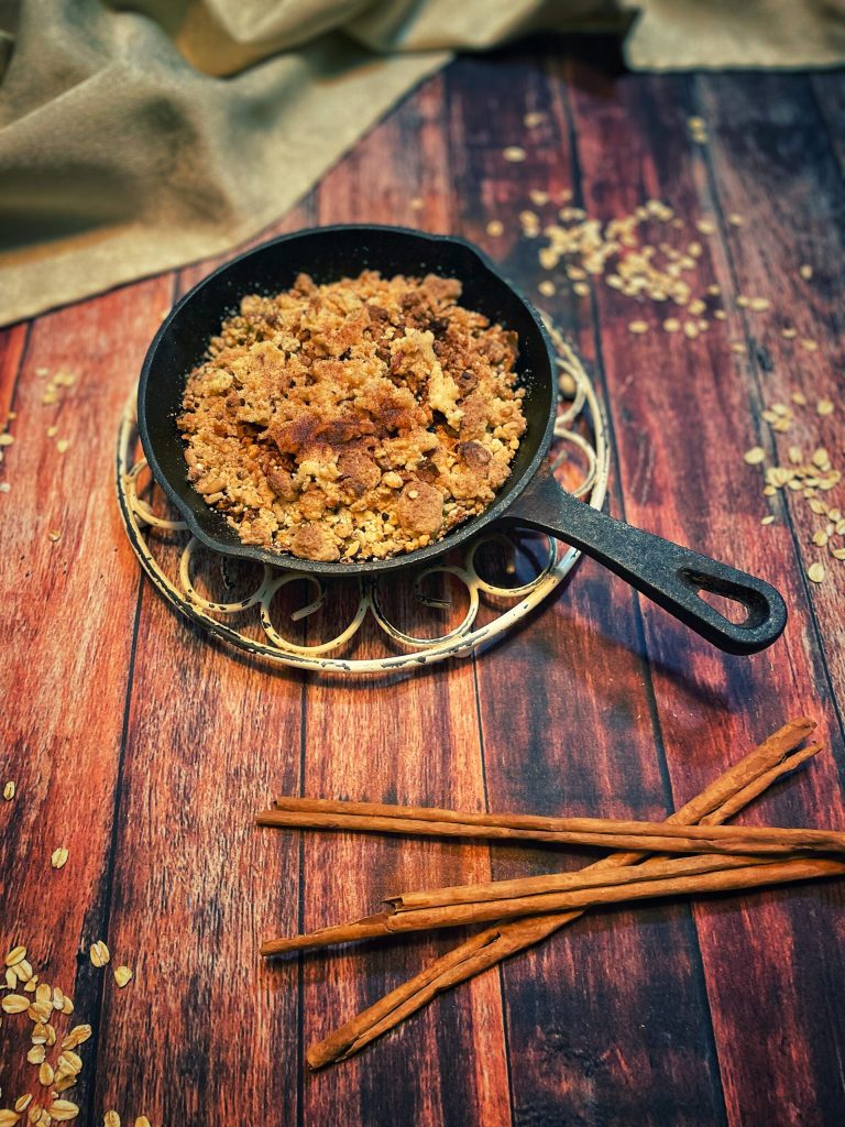 Le nappage streusel sur une base d’avoine rend le plat proche d’un « crisp » ou « crumble » de fruits, mais avec la consistance plus solide et en portion individuelle de l’avoine cuite.