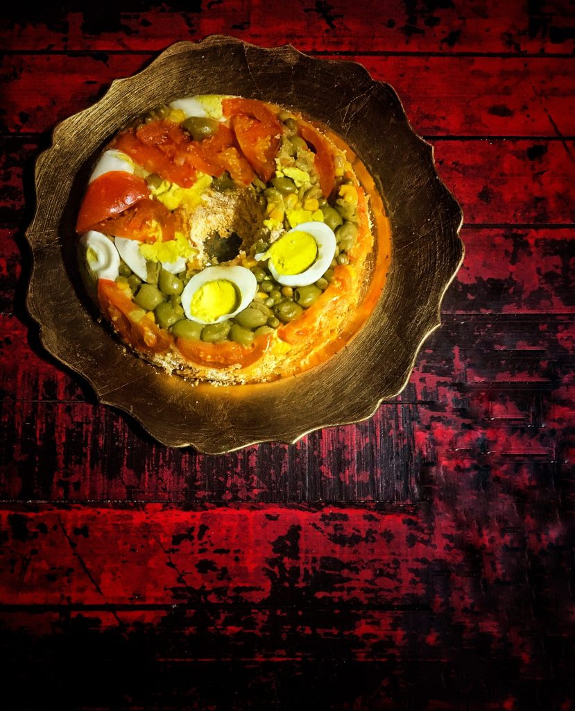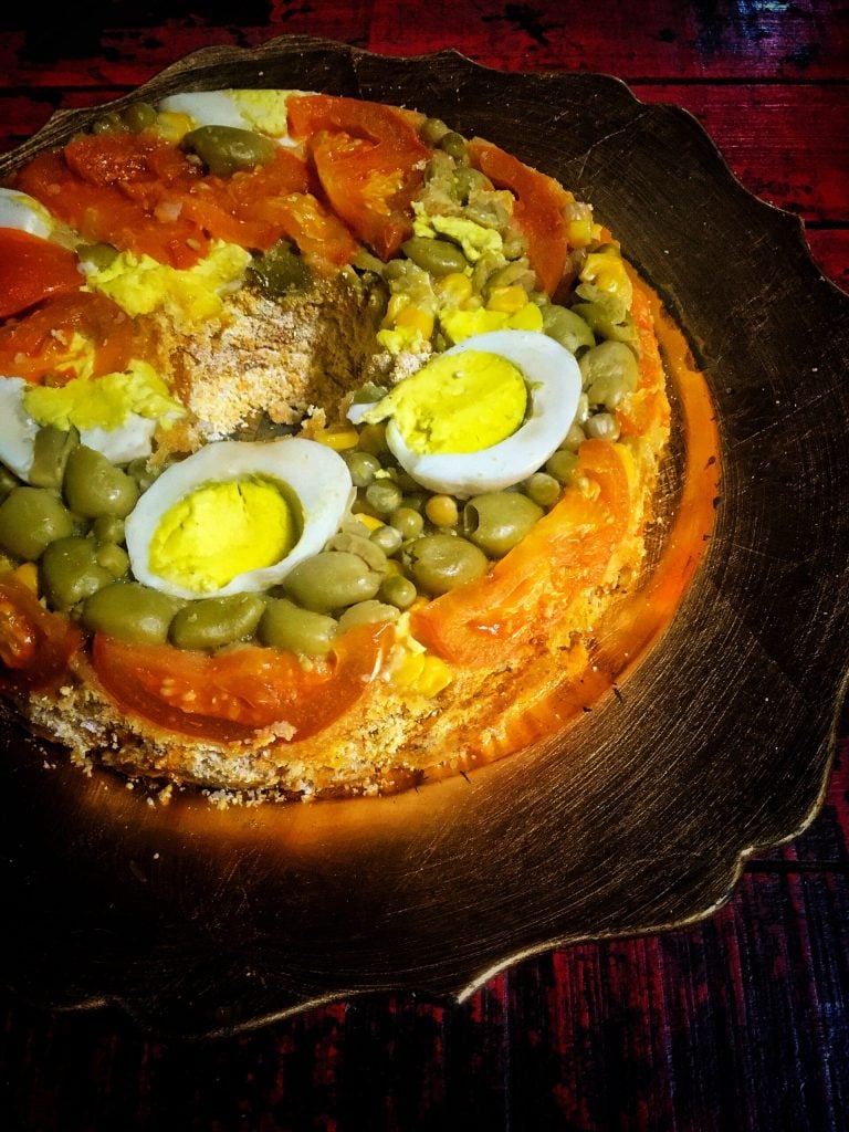 Généralement enrichi de petits pois, maïs, tomates, olives, œufs et cuit à la vapeur dans le moule en forme de couronne classique.
