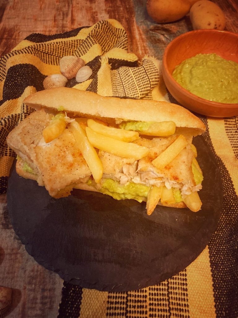 Le Fish and Chips butty est un sandwich avec des frites et une sauce (chips butty), ici dans la variante « fish and chips » avec cabillaud en pâte à frire et frit et une sauce aux pois et yaourt grec.