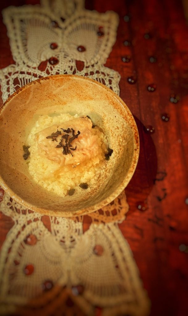 Flétan avec riz gluant dans un bouillon de miso