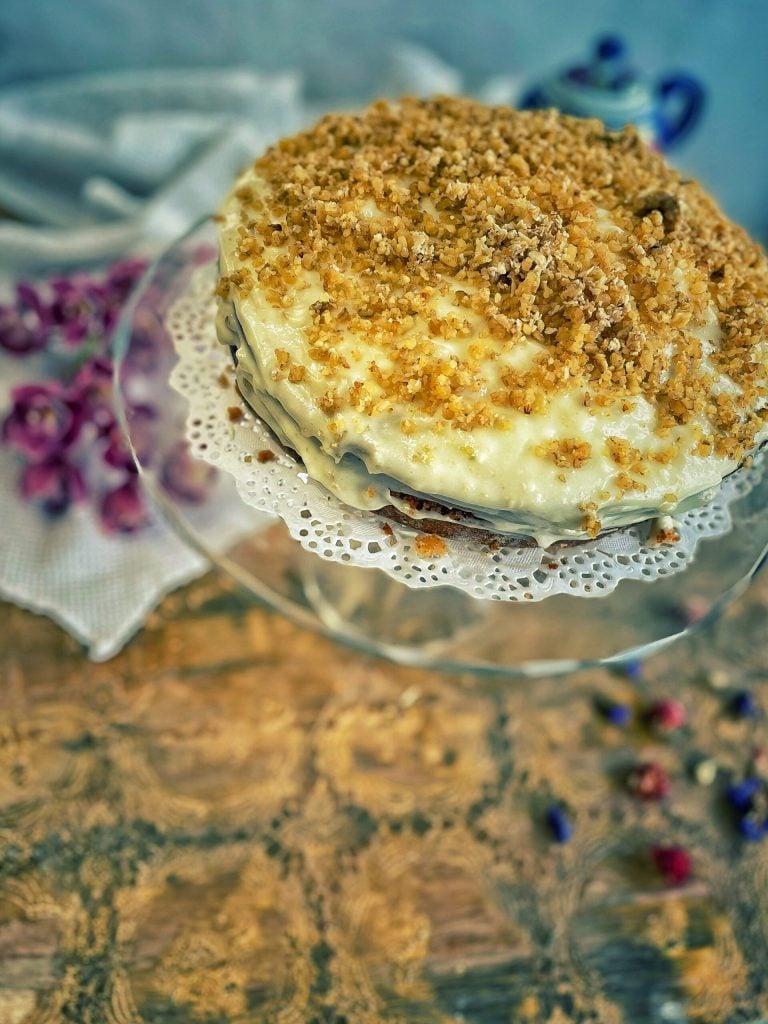 Le gâteau du sud a généralement deux ou trois couches avec des noix de pécan (ou noix), et un glaçage au fromage crémeux sucré qui est également la garniture des couches.