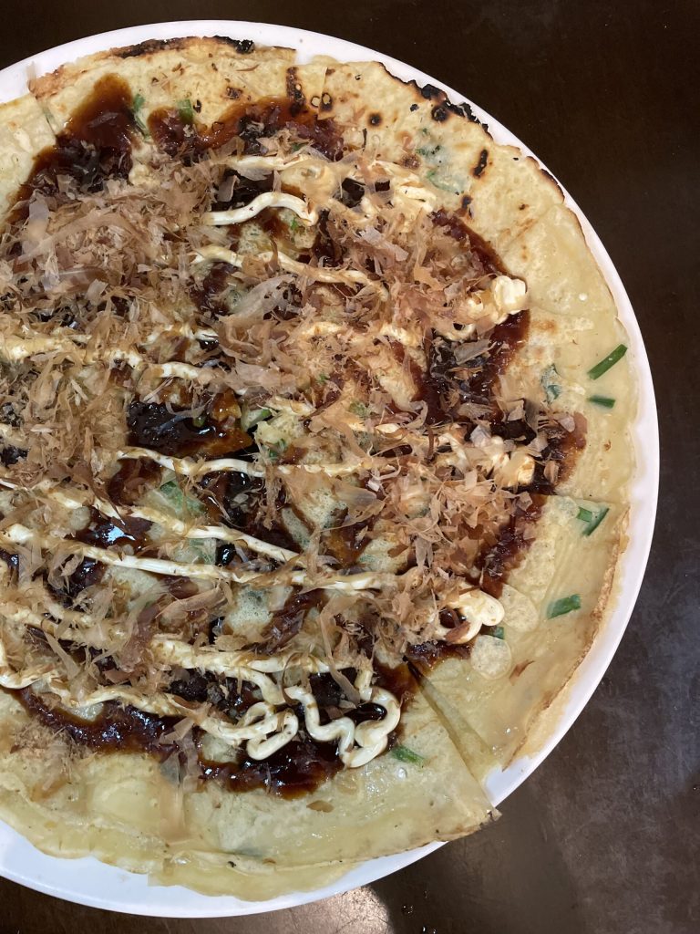 Une fois que la crêpe est bien dorée des deux côtés, retire-la de la poêle et sers-la chaude, avec l’ajout de katsuobushi et de sauce.