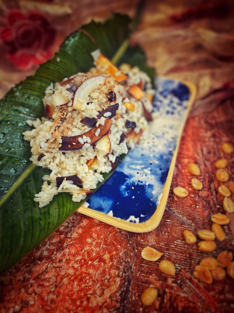 Htamane (ထမနဲ) est un plat salé traditionnel birman composé principalement d’un mélange de riz gluant, de copeaux de coco frits, de cacahuètes grillées, de sésame grillé, d’huile d’arachide et de gingembre.