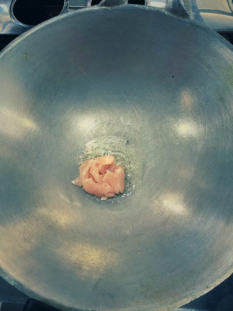 • Préchauffer une quantité d’huile dans un grand wok ou une poêle à feu moyen. Ajouter le poulet, en utilisant une spatule pour s’assurer que les morceaux ne collent pas.