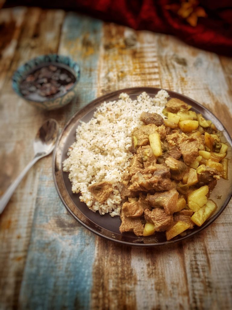 Une fois la cuisson terminée, ajouter encore 2 verres d’eau pour rendre la sauce plus crémeuse et le roux de curry préparé au préalable.