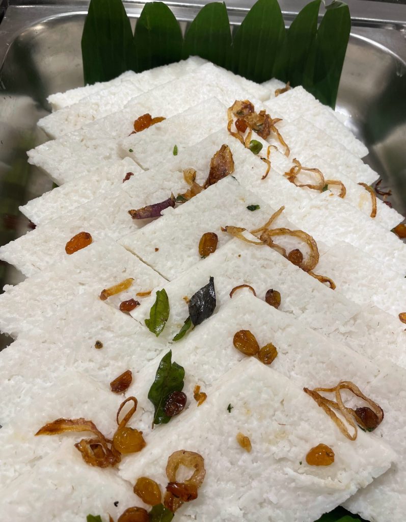 Verser dans le moule : Transfère le riz sur une assiette ou un plateau légèrement huilé avec de l’huile de coco, lisse la surface avec une cuillère mouillée.Décorer : Saupoudre d’oignon frit dans l’huile de coco ou dans le ghee et de raisins secs. Presse légèrement.