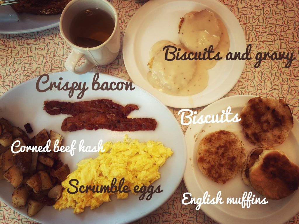 Si vous allez prendre le petit déjeuner dans un diner, vous pouvez commander un petit déjeuner américain complet qui consiste en : œufs, viande, bacon et saucisse, hashbrowns et toast ou pancake.
