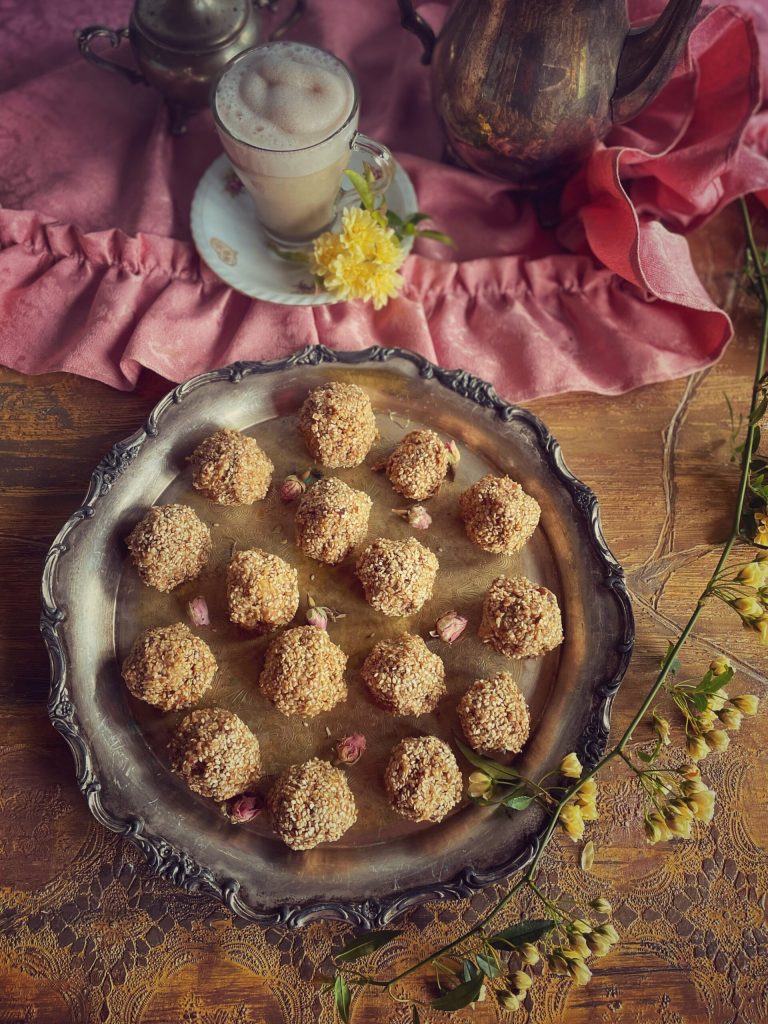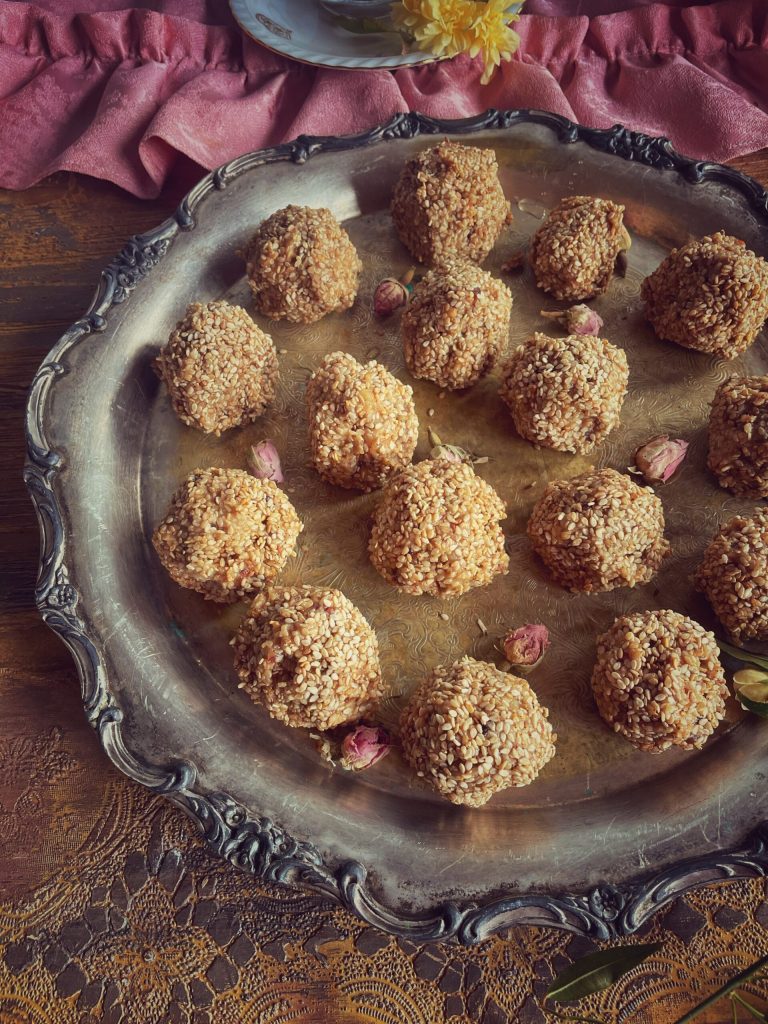 Graines de sésame ou noix : Utilisées pour l’enrobage extérieur (pour faciliter la manipulation) ou comme insert croquant à l’intérieur de la pâte. Les noix (jowz) sont l’ajout traditionnel le plus courant pour les occasions spéciales.
