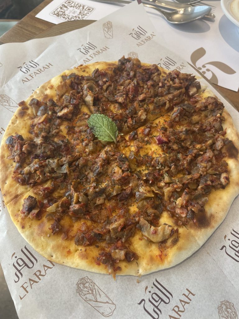 Réalisé avec pâte à pain assaisonnée avec du za’atar (thym séché moulu, origan, marjolaine ou une combinaison de ceux-ci mélangés avec des graines de sésame grillées, du sel et d’autres épices comme le sumac) mélangé à l’huile d’olive.