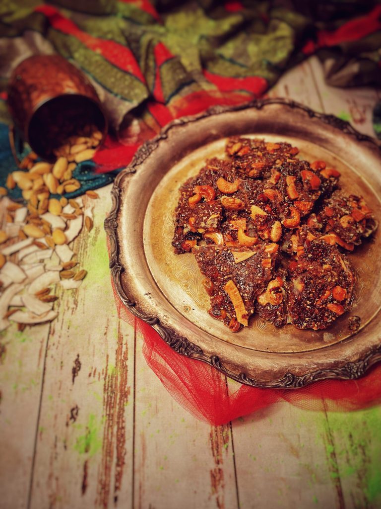 Une sorte de croquant épicé avec des fruits secs au choix, il est également essentiel d’avoir : ghee, graines et évidemment le jaggery.