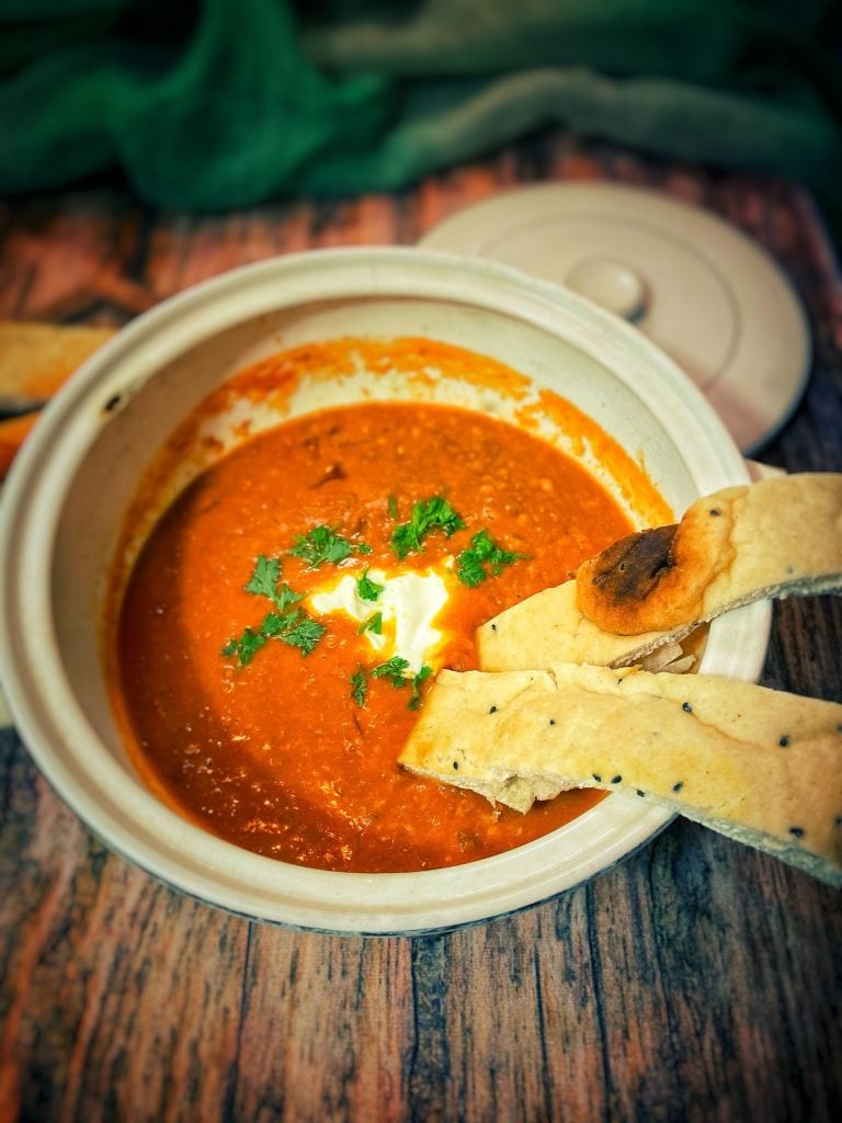 Ajuster le sel et les épices.Servir avec du pain pita ou des croûtons et une cuillère de yaourt.