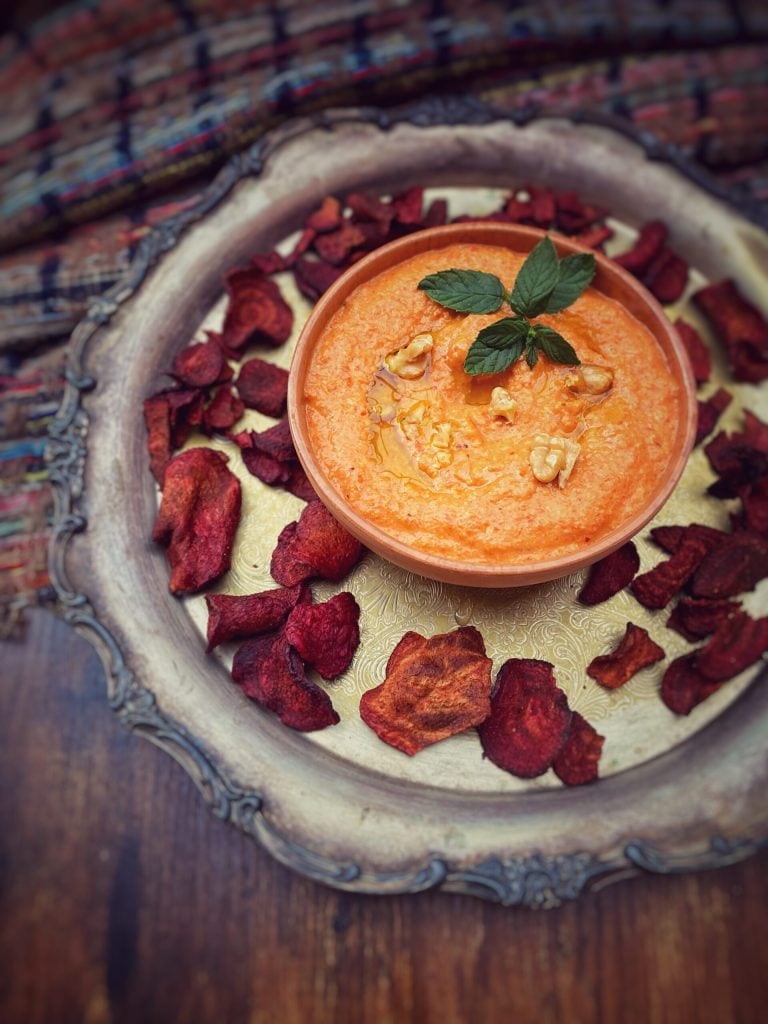 Hacher ensemble les poivrons et les noix, ajouter l’huile, l’ail, le jus de citron, la chapelure, le cumin. Ajuster le sel.