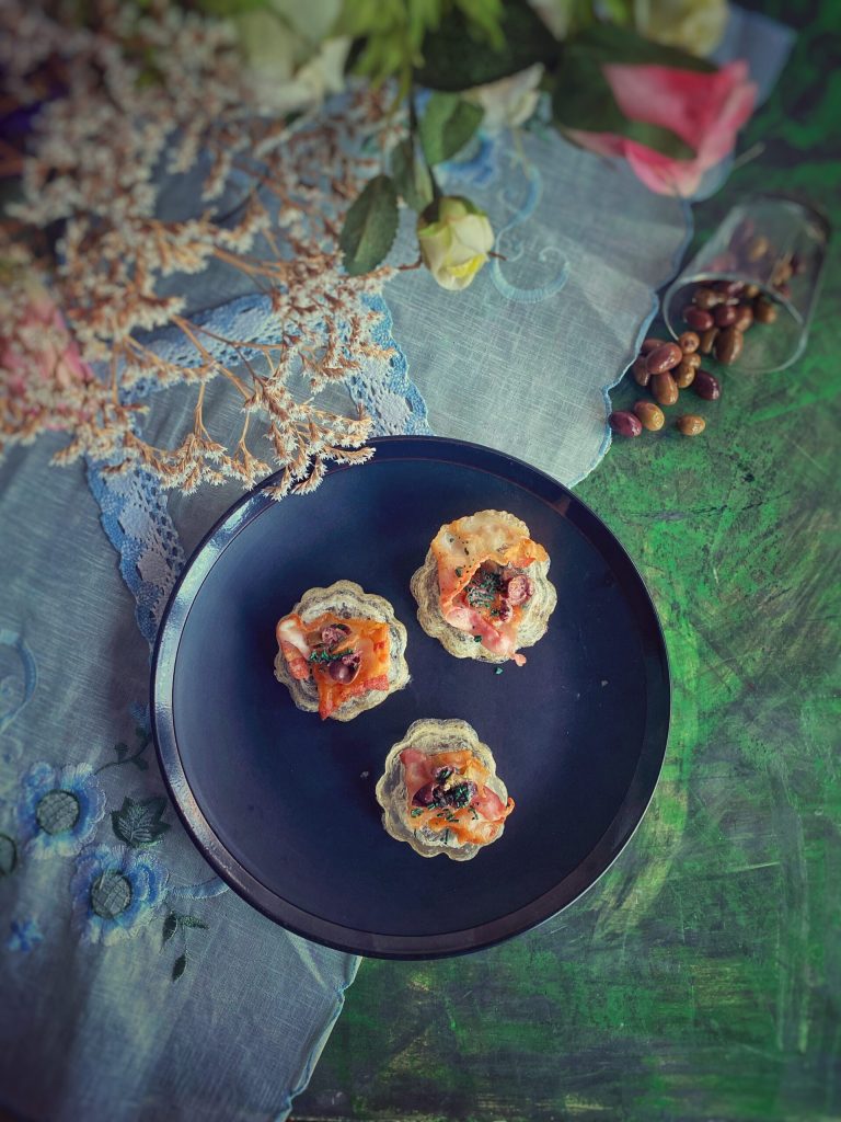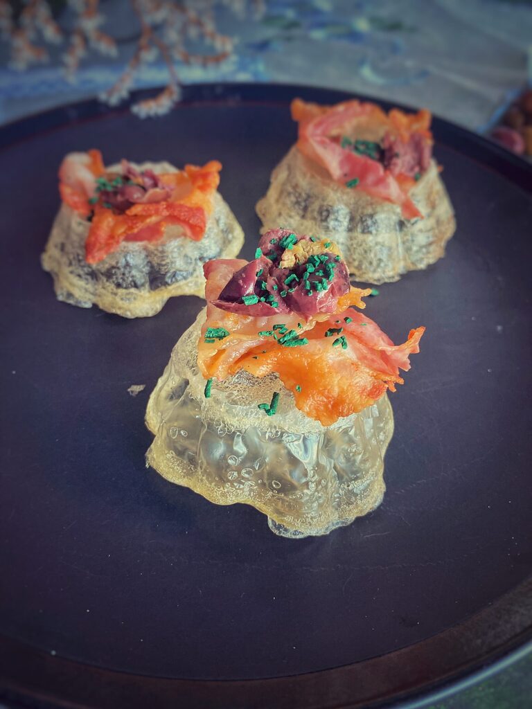 Le Pain de Cristal est une gelée parfaitement neutre au goût, aérée et déshydratée au four, dans la version originale du chef Albert Adrià, rockstar de la cuisine moléculaire qui a dirigé pendant des années l’un des restaurants symboles de la haute gastronomie – El Bulli, accompagné d’une crème de jambon ibérique et d’une râpée de truffe noire, dans ma version avec bacon, spiruline et olives.