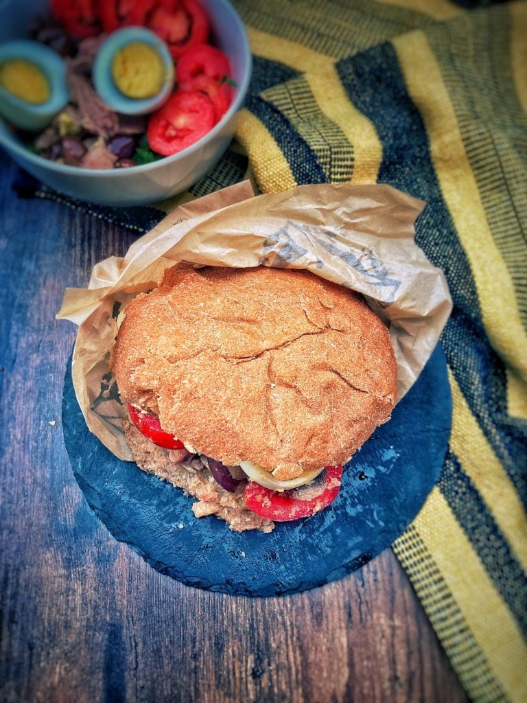 Le sandwich est principalement garni de thon, anchois, tomate en tranches, olives, œufs durs, huile d’olive, sel et poivre, mais peut aussi contenir de la roquette, du basilic, des artichauts et du vinaigre de vin rouge, ou les éléments que vous préférez de la salade niçoise.