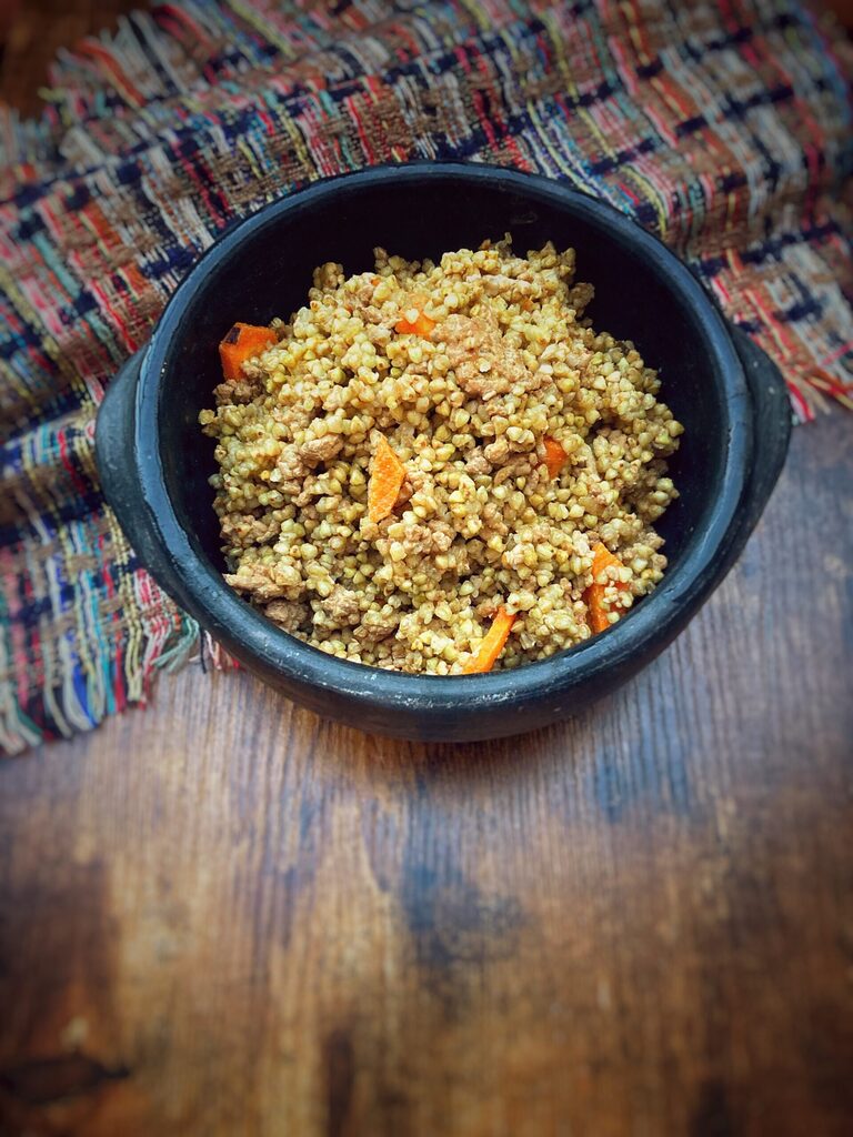 Ajouter le porc, assaisonner avec du sel et du poivre, le sarrasin et enfin le bouillon (ou l’eau) – rapport sarrasin : eau, 1:2 –