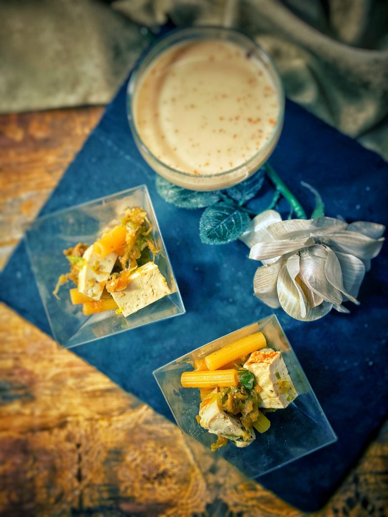 Je vous les propose dans une version « finger food » accompagnée de Milk Punch vegan, avec lait de soja, pour vous montrer la polyvalence du tofu, trop souvent injustement critiqué.