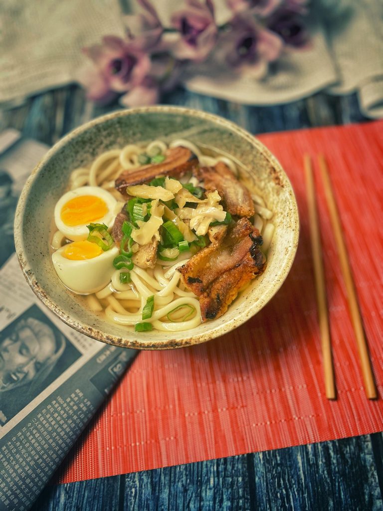 4. Mettre les udon dans un bol, ajouter la viande avec le bouillon chaud par-dessus. Terminer avec l’œuf cuit sur le dessus et un peu d’oignon vert haché pour garnir.