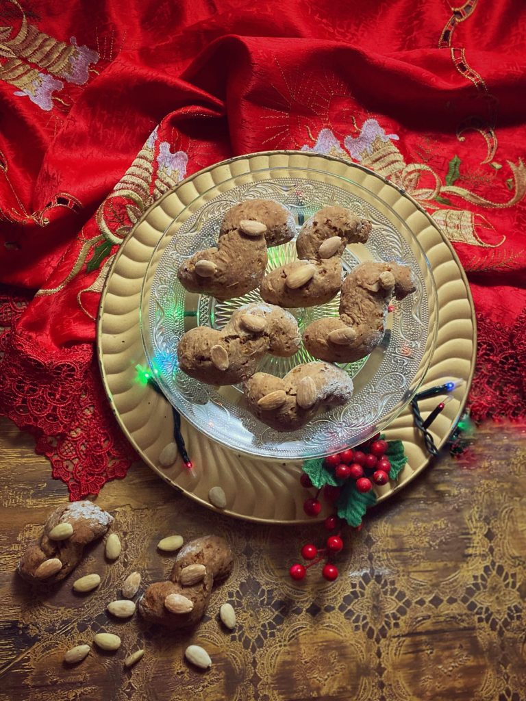 Réalisés avec de la farine, du sucre, des amandes et du miel, auxquels s’ajoute le pisto (un mélange d’épices à base de cannelle, clous de girofle, muscade et anis étoilé) ; je les ai préparés sans gluten avec de la farine de riz.