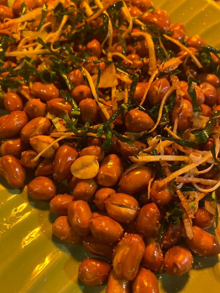 Thua Thawt Samun Phriai sont des cacahuètes frites avec des feuilles de lime makrut, de l’ail et des piments.