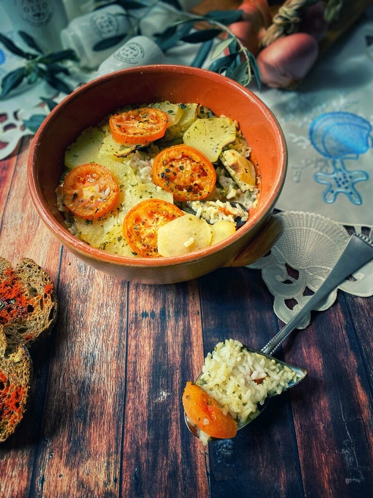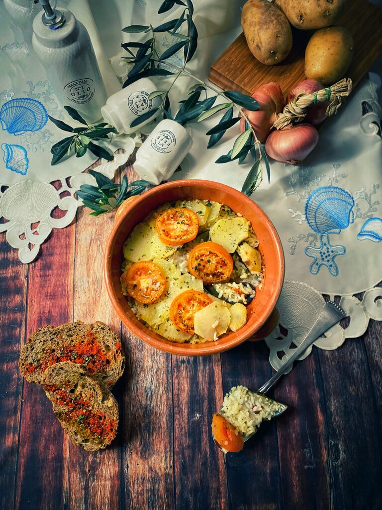 ▶▶La tiella barese est en effet répandue avec des variantes locales également dans le Salento, où elle est appelée tajeddha ou, plus simplement, « riz, pommes de terre et moules », avec les mêmes ingrédients souvent cuits dans un plat en terre cuite (localement appelé tajeddha).