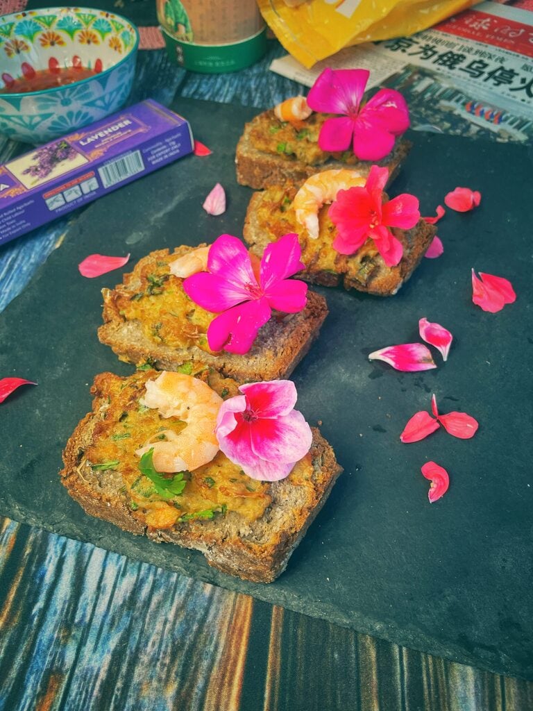 Cette version ne prévoit pas l’utilisation de graines de sésame, restant fidèle à la préparation originale de Hong Kong, enrichie de géranium rose et, pour une version sans gluten, j’ai également préparé un pain de mie à base de farine de sarrasin.