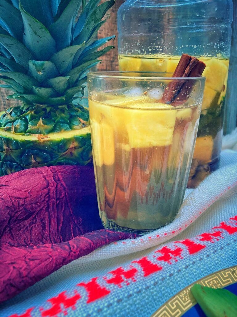 Je l’ai accompagné du Tepache, l’une des plus célèbres boissons fermentées mexicaines*, réalisée à partir de la fermentation de l’ananas (les écorces), adoucie avec piloncillo ou sucre de canne et avec cannelle, et servi froid, surtout dans les stands de rue.