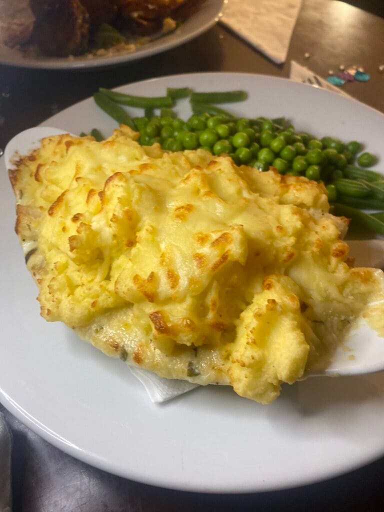 À la place : une garniture de purée de pommes de terre (parfois avec du fromage ou des légumes comme des oignons et des poireaux) pour couvrir le poisson pendant la cuisson, comme pour la Shepherd’s pie (c’est pourquoi elle est souvent appelée tourte du pêcheur).