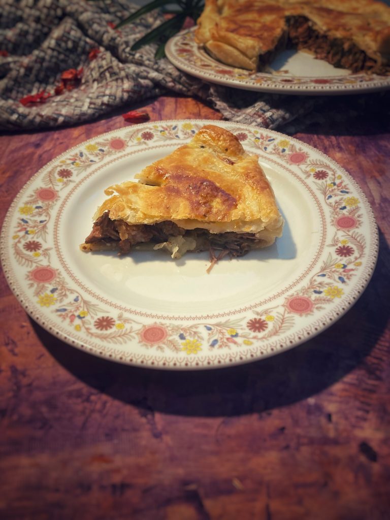 Feuilletée (Puff Pastry) : C’est l’idéal si tu veux une tourte haute, légère et spectaculaire. Le contraste entre le croustillant beurré de la pâte feuilletée et la viande sombre et épicée du Pepperpot est exceptionnel.