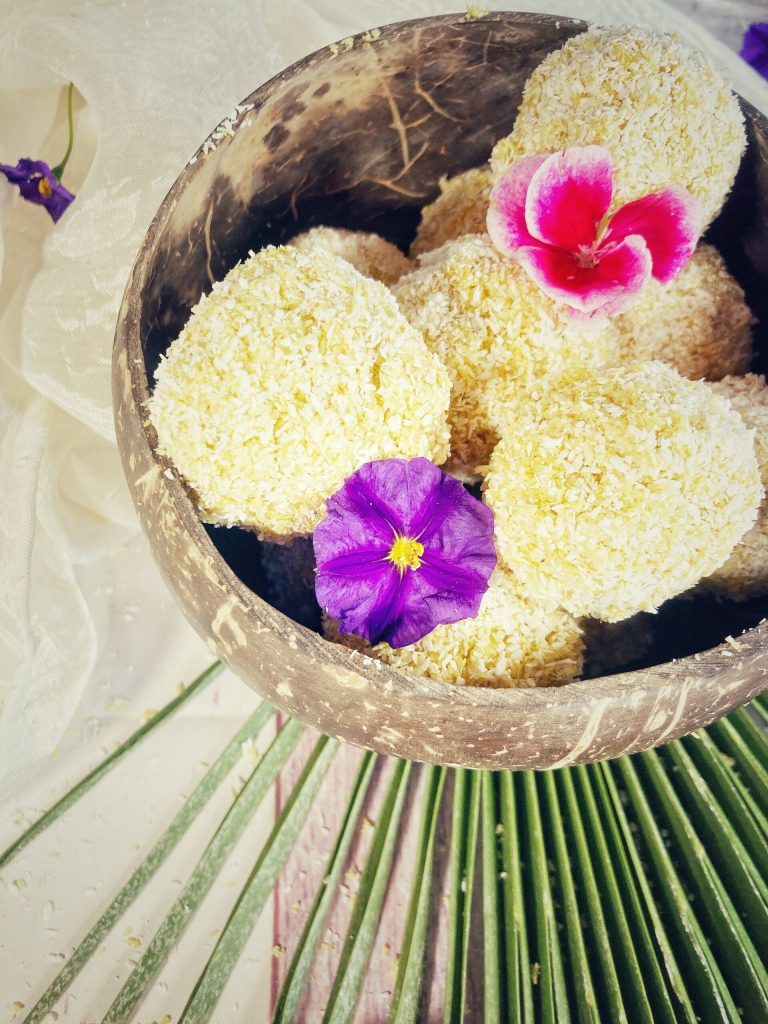 Former des petites boules à rouler dans le reste de noix de coco râpée.
