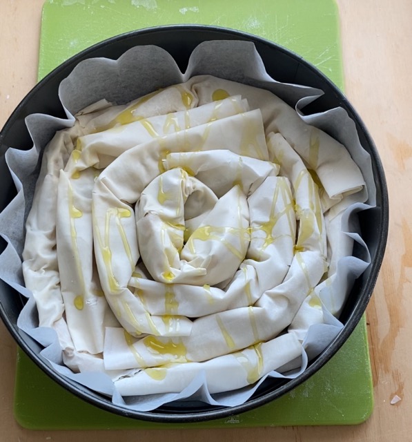 Plaats alle opgerolde vellen in de springvorm en eindig met een scheutje olijfolie. Bak in je heteluchtfriteuse op 180° graden gedurende ongeveer 30 minuten of in de oven op dezelfde temperatuur gedurende ongeveer 40 minuten.