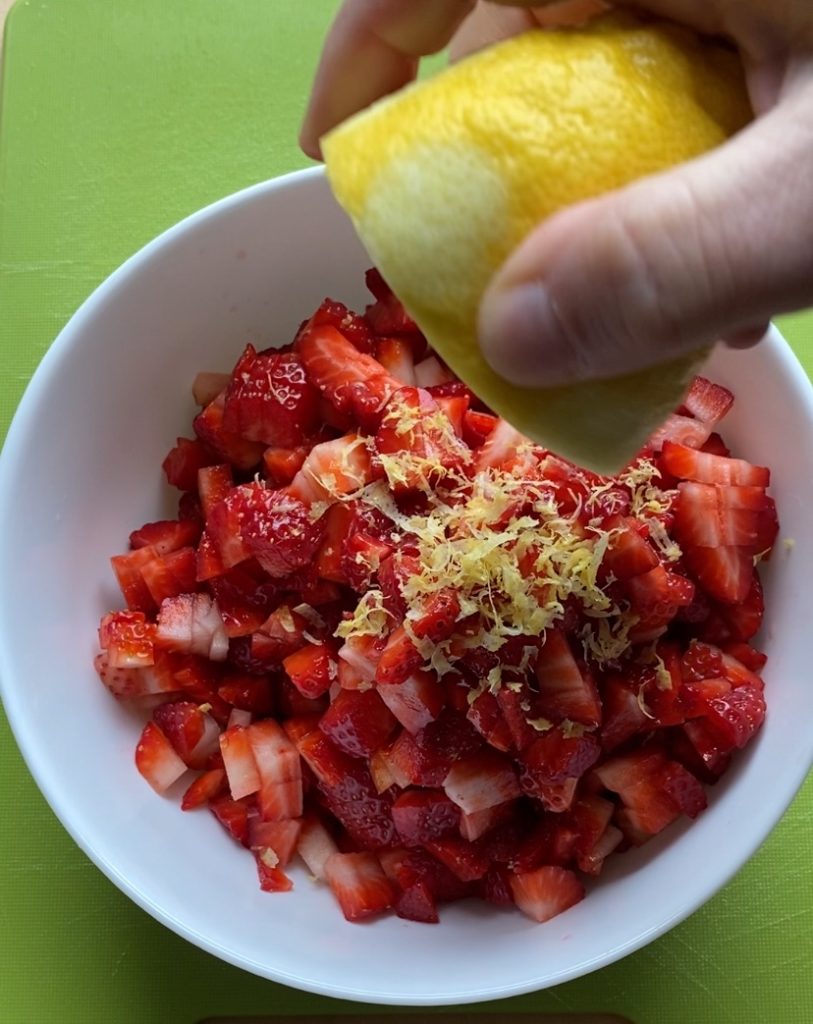 Snijd de aardbeien in stukjes, rasp de schil van een citroen en pers een kwart uit. Laat een kwartier rusten om de siroop te vormen.