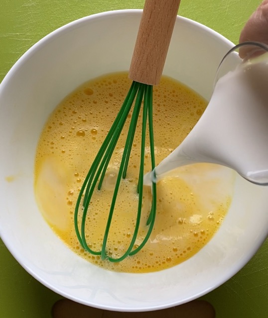 Voeg de suiker toe en vervolgens de amandelmelk en meng.