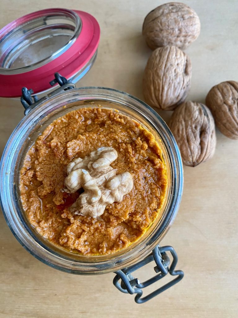 Bruschetta met rode pesto en walnoten, een van mijn recepten die in vijf minuten klaar zijn, zonder gedoe.