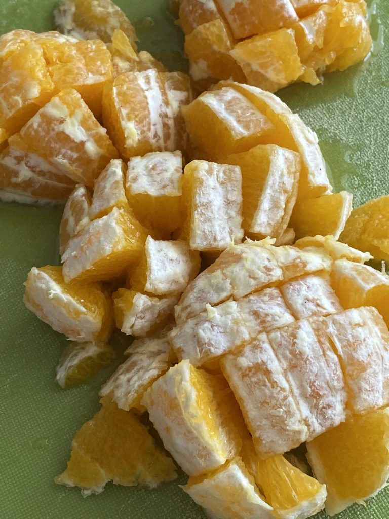 Schil en snijd twee grote sinaasappels in grove stukken.