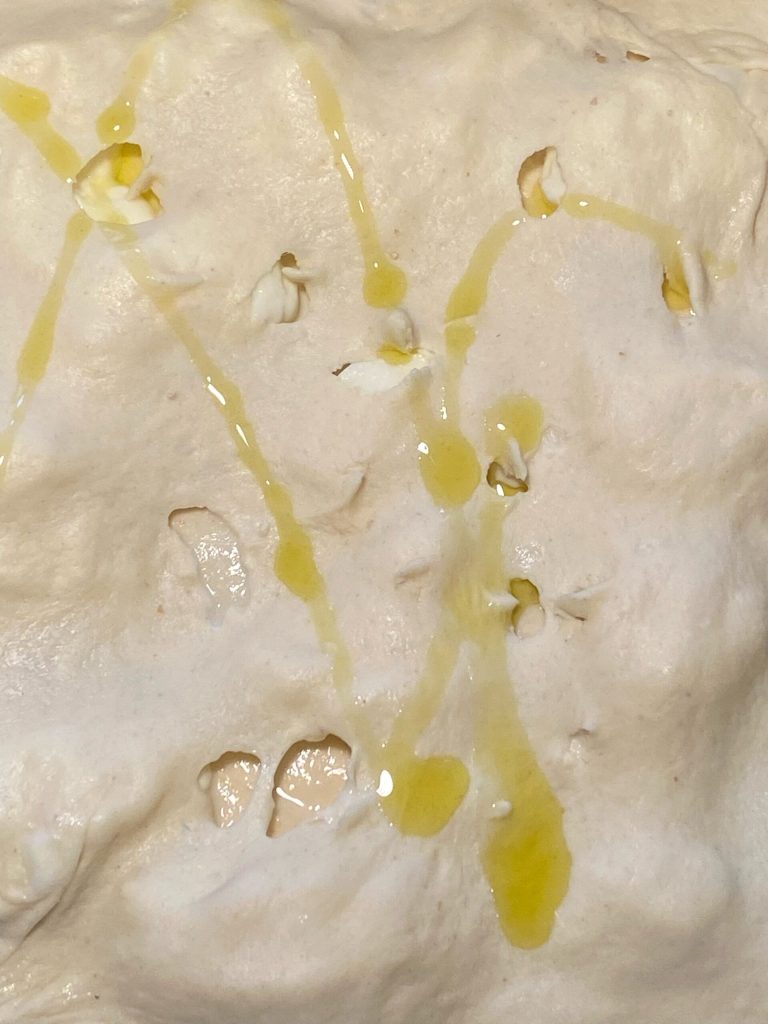 Na een uur verdeel je het deeg in twee delen, de tip is om het deeg niet in twee gelijke delen te verdelen, omdat het deel dat je als basis voor de focaccia gebruikt iets groter moet zijn dan het deel dat de focaccia bedekt.