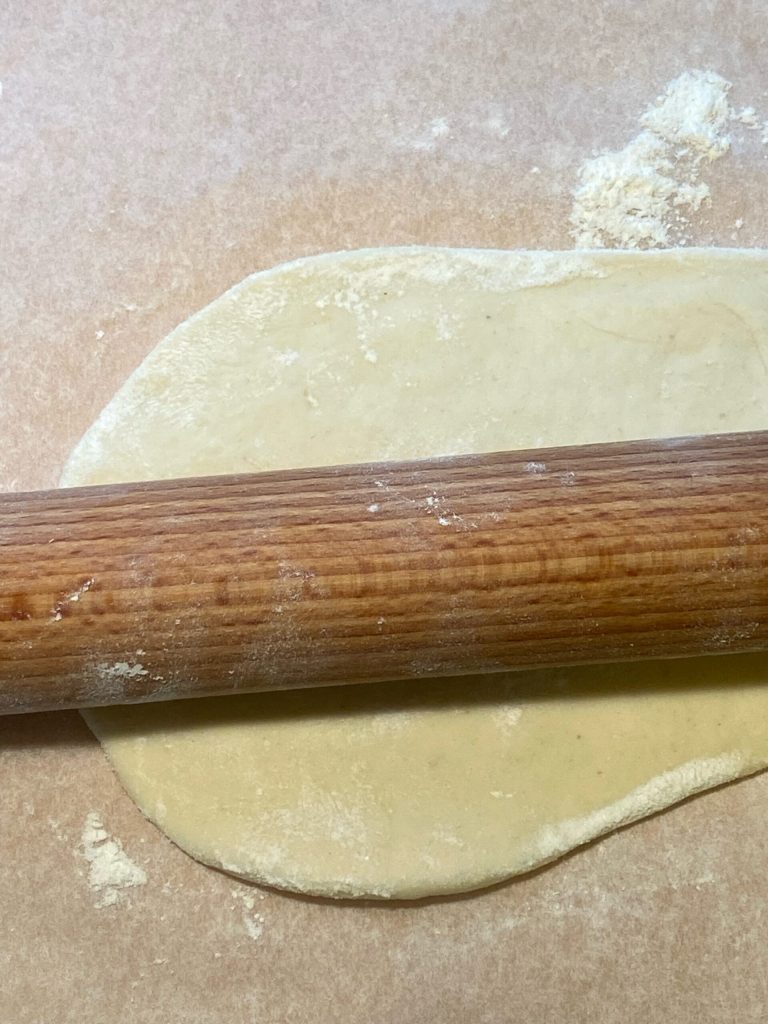 Bestuif het deeg bovenop en onderop en rol het uit met een deegroller om het dun te maken.
