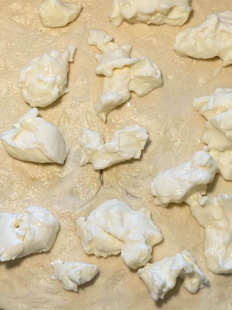 Plaats de stracchino kaas in kleine stukjes ter grootte van een walnoot over de gehele basis.