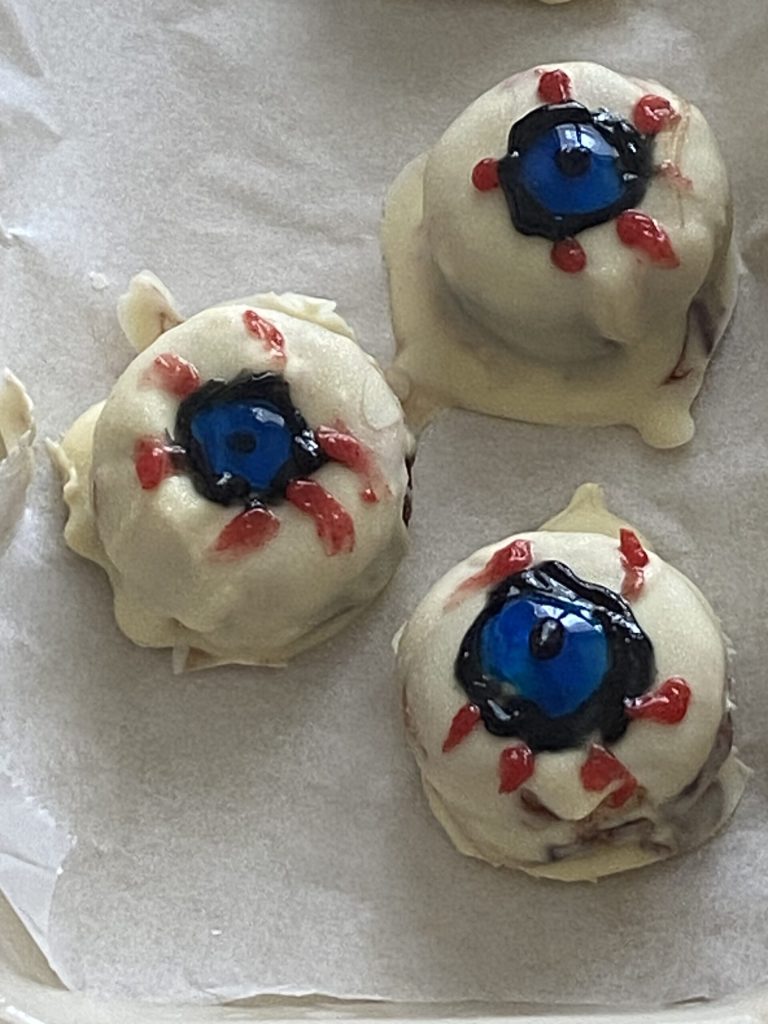 Haal ze na een uur uit de vriezer en decoreer met de decoratiestiften, door een blauwe cirkel te maken (je kunt het blauw van het oog bereiken door een smartie te gebruiken, die moet onmiddellijk worden geplaatst voordat het oog de vriezer in gaat), teken een zwarte cirkel in de blauwe cirkel, trek een zwarte stift om de blauwe cirkel en maak tot slot streepjes op het oog met de rode stift.