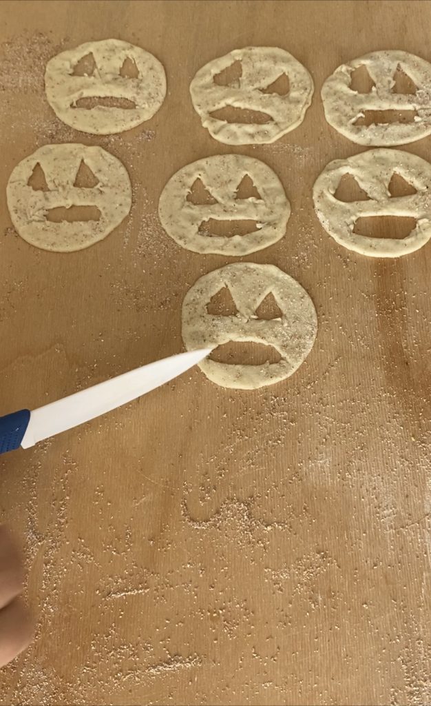 Teken het gezicht van Scream op een bakpapier, plaats de tekening op de focaccia en gebruik een mes om de randen te snijden en vorm het deeg in de vorm van Scream, een spook en een pompoen. Zorg ervoor dat de kinderen niet te jong zijn.