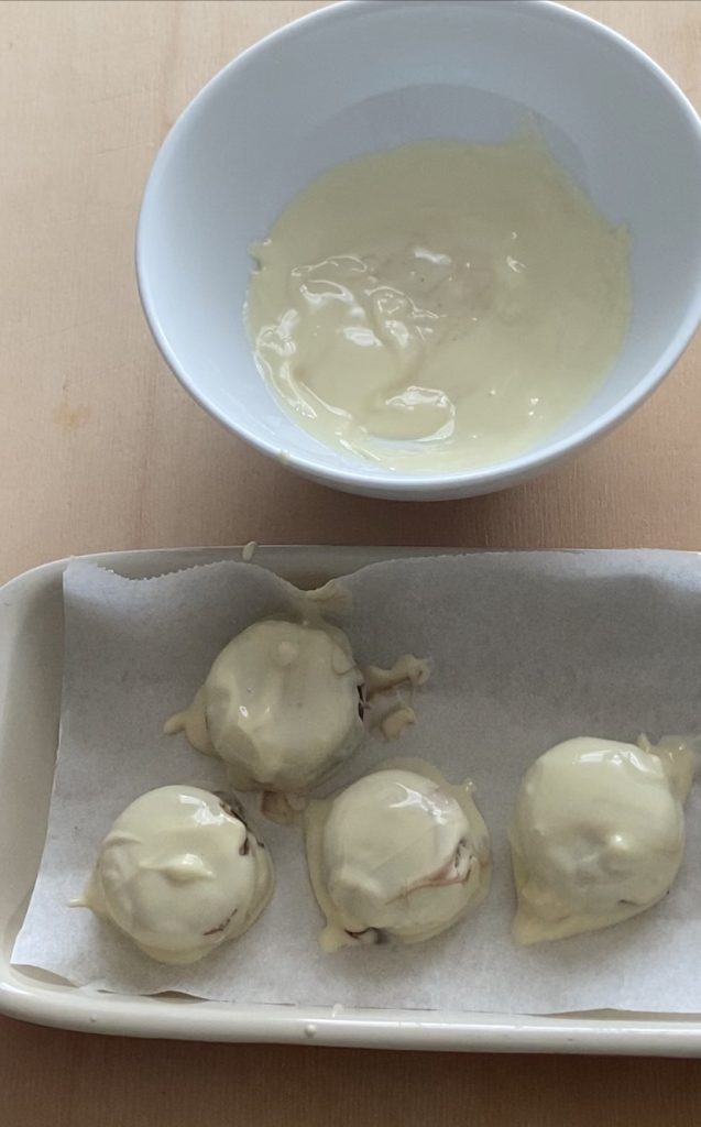 Dompel de baci di dama in de gesmolten chocolade, leg ze op een bakpapiervel en plaats ze in de vriezer.