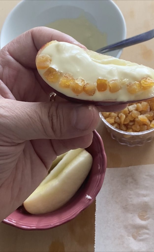 Smeer een beetje gesmolten witte chocolade op het plakje appel.