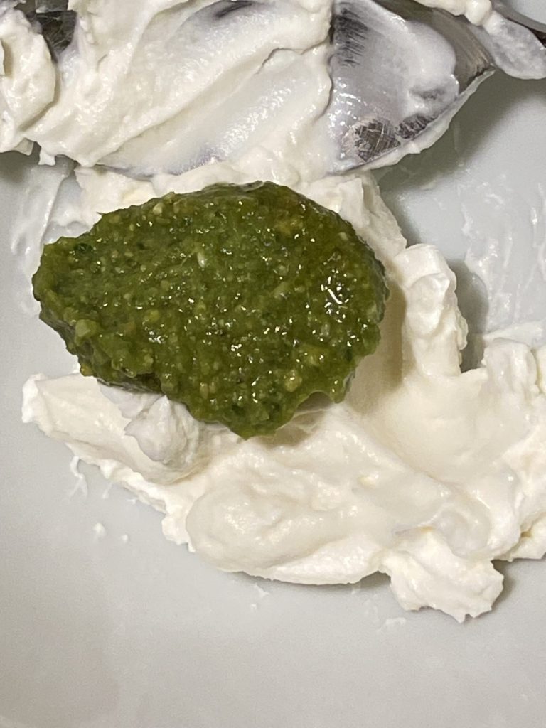 • Meng twee eetlepels smeerkaas goed met de twee theelepels pesto