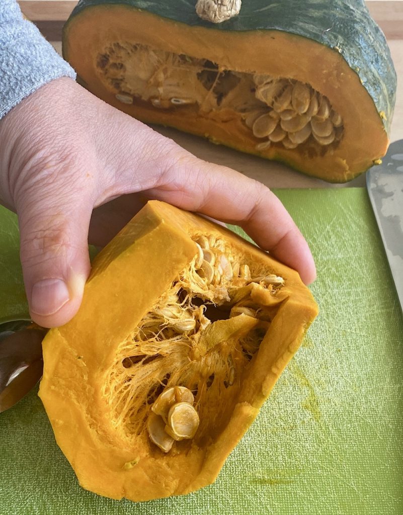 Terwijl de aardappelen worden “voorgekookt”, neem een Delica pompoen en was deze.