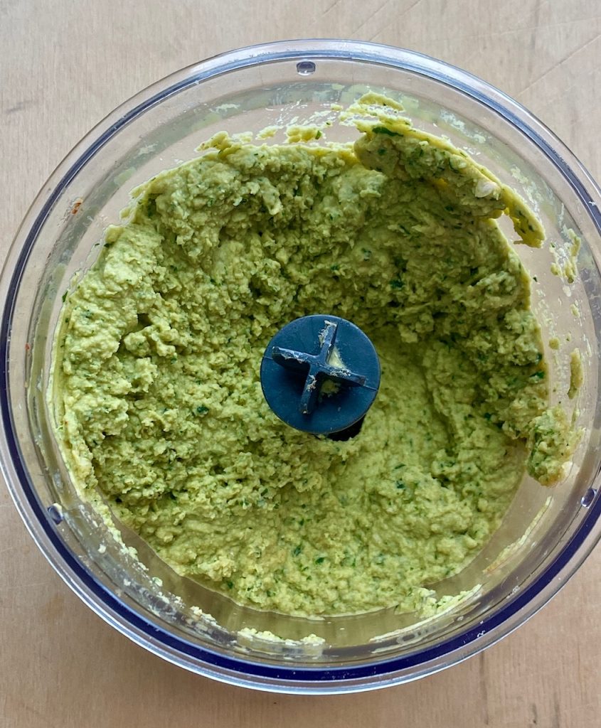 Vervolgens hoef je alleen maar de gekookte kikkererwten en de geroosterde pijnboompitten in een hakmolen te doen.