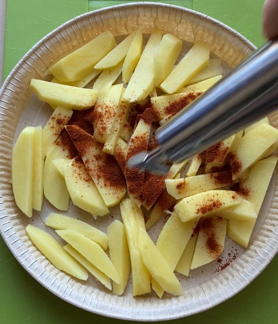 • Doe de aardappelen in een container voor de airfryer en breng op smaak met een theelepel gerookte paprikapoeder.