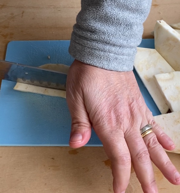 Snijd de knolselderij in plakjes en daarna in reepjes.