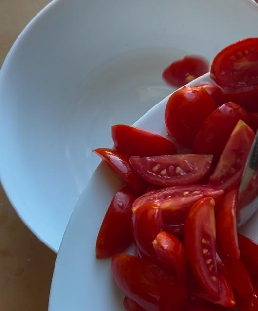 • Was en snijd de cherrytomaatjes doormidden en voeg ze toe aan de gekookte kip en courgettes, meng voorzichtig.