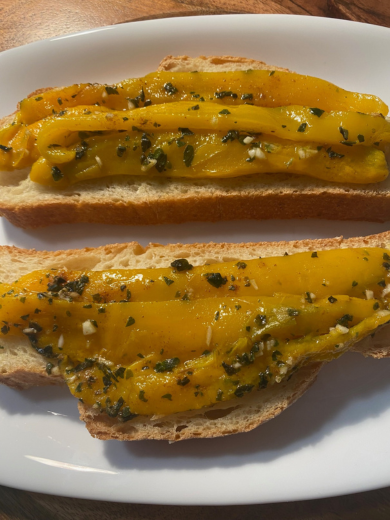 Bovendien combineert de natuurlijke zoetheid van paprika, vooral die van de gele die ik voor dit gerecht heb gebruikt, perfect met de intense smaak van knoflook en de fruitige geur van extra vergine olijfolie, de geur van oregano en de pittigheid van chilipeper.