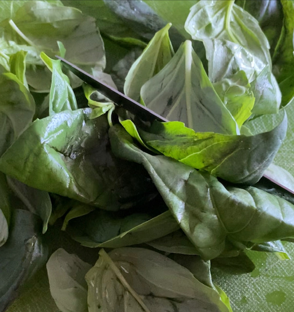 • Snijd de basilicum in grote stukken, je hebt het nodig voor zowel de saus als de gehaktballen.