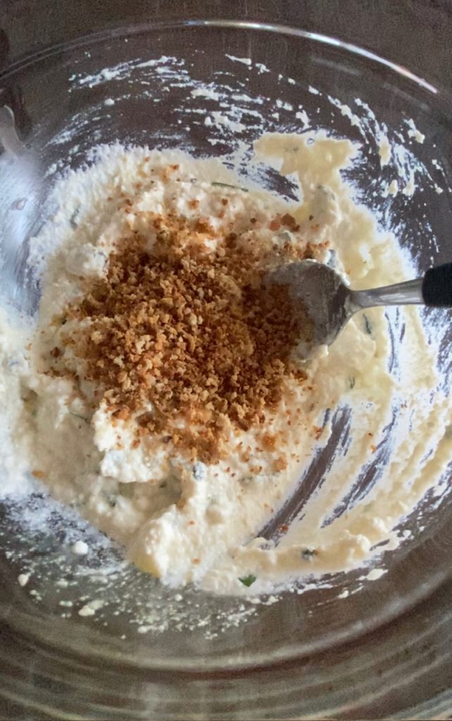 • Doe alle ingrediënten in een kom, de koemelk ricotta, de schapenmelk ricotta, een ei, twee eetlepels Parmezaanse kaas, de basilicum en rasp de citroenschil.